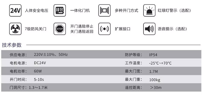 ●具有遇阻返回或遇阻停功能,开门后可设置延时自动关门,配合门禁装置,可实行无人值守;