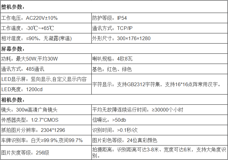 ● 300万像素车牌识别摄像机,车牌识别率: 白天≥99.9%,夜间99.7%;